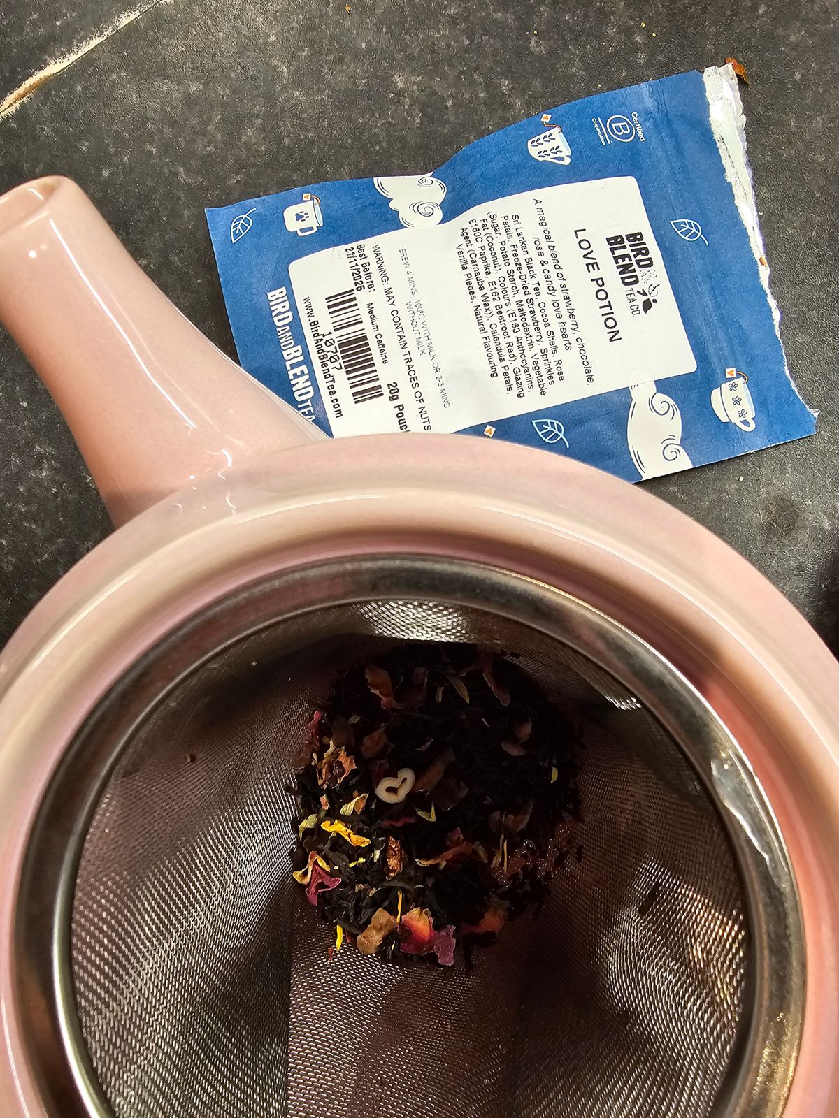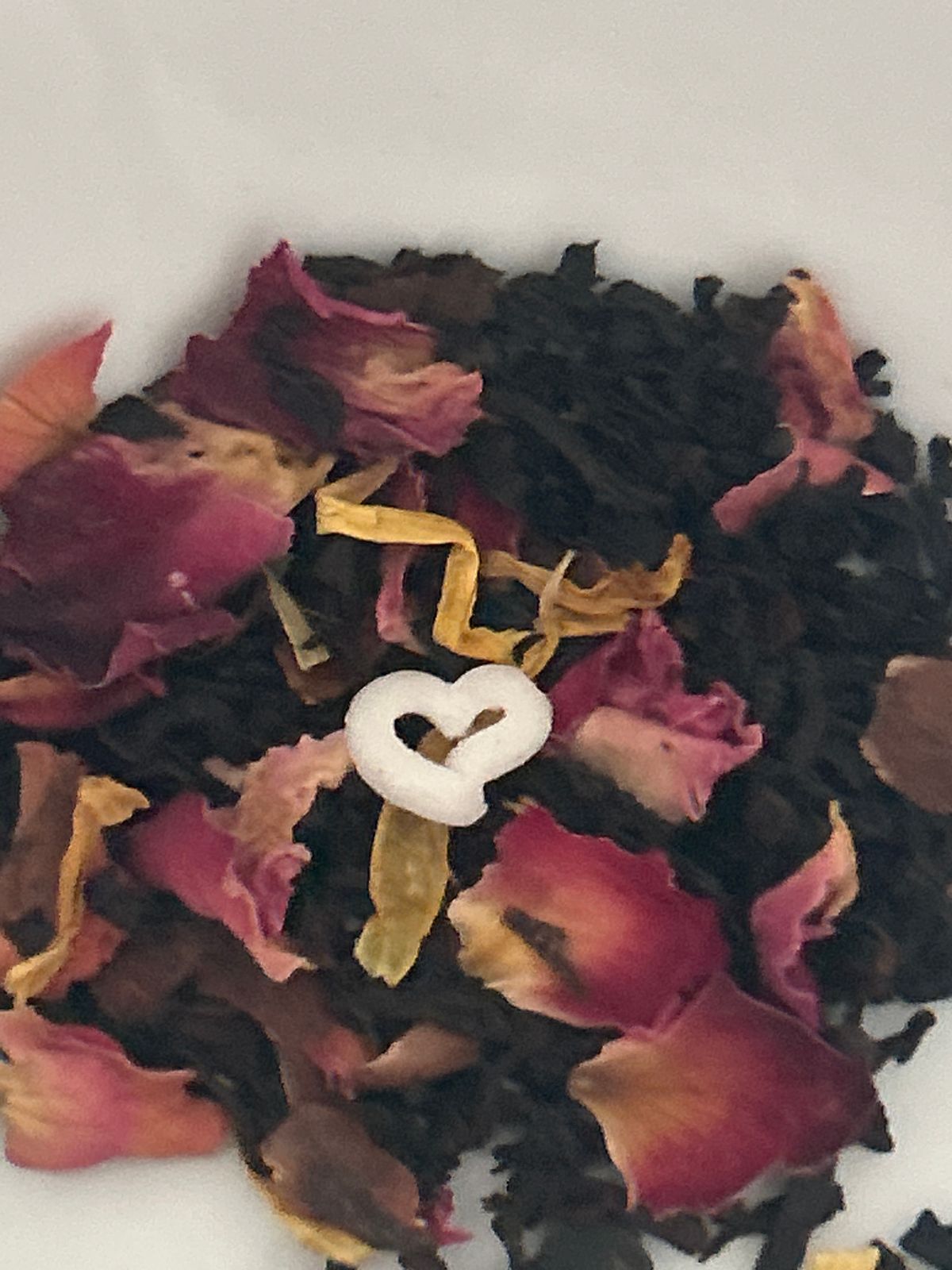 A beautiful black tea, with a chocolate rose underneath it that hints at chocolate covered treats and lends itself very well to being paired with cake or biscuits, or just on its own. Super yummy!