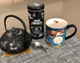 spiced pumpkin pie limited edition tea tin with hot tea and spoon