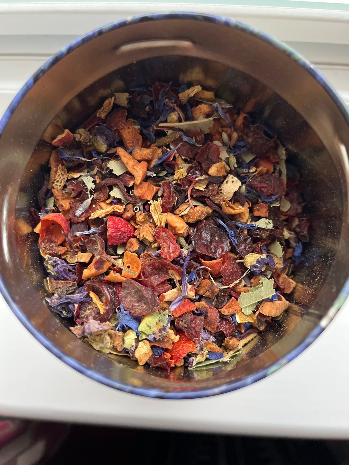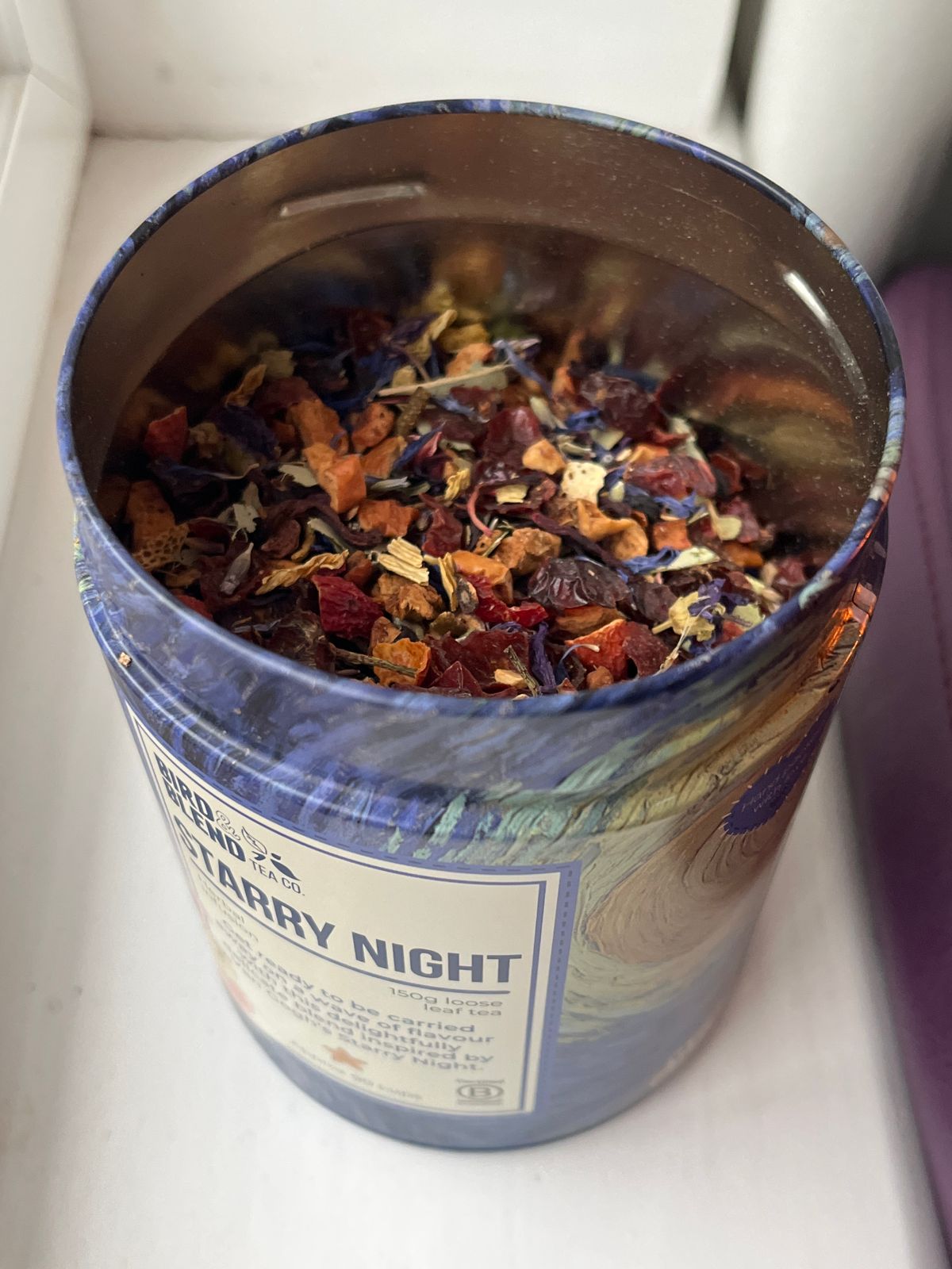 First off, the tin is so pretty and the dry tea itself is very beautiful to look at - it captures the colours of the painting perfectly. The scent of it dry is fab - it somehow reminds me of Refreshers sweets, and manages to smell fizzy!